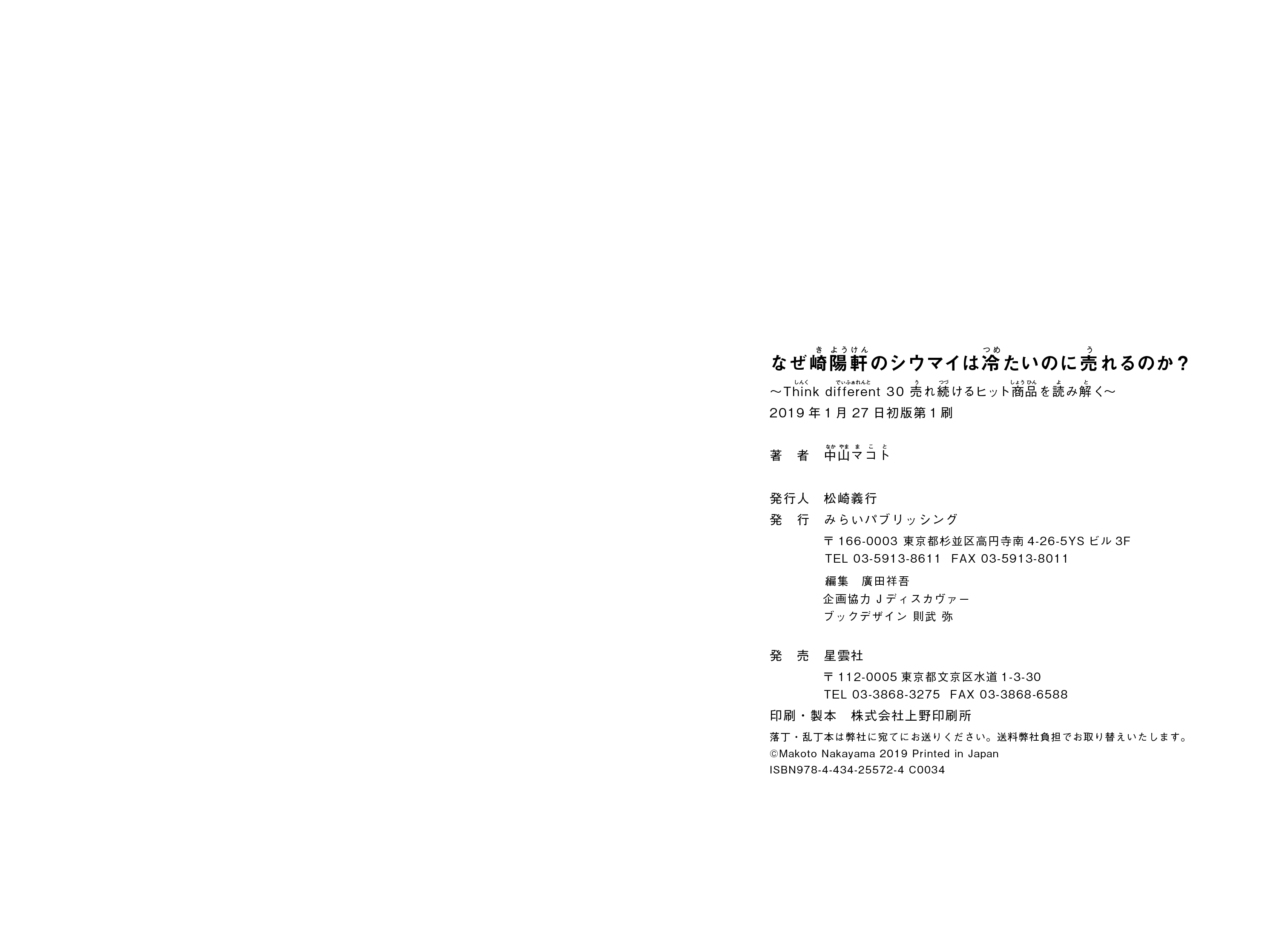 みらいパブリッシング(所在地:東京都杉並区高円寺、代表取締役:松崎義行)は「なぜ崎陽軒のシウマイは冷たいのに売れるのか?」を1月27日に刊行しました。 著者:中山マコト(ビジネス作家兼フリーランス成功実現アドバイザー、言葉のチカラ研究者兼コピーライティングアドバイザー) 本体1,300円+税 四六版 ソフトカバー 200ページ ISBN:978-4-434-25572-4