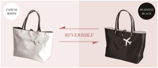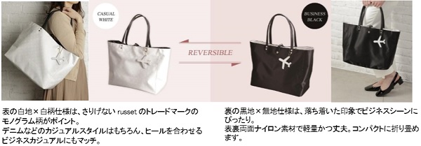 ANAとrussetがコラボレーションしたトートバッグは、大人のキャリア女性に向けた、ビジネスにもカジュアルにも使えるリバーシブルバッグです。軽量で収納力もありながら、オシャレで汎用性のあるバッグに仕上がりました。表の白地・白柄仕様はカジュアルスタイル、裏の黒地・無地仕様はビジネス場面など、シーンに合わせて使い分けていただけます。クラッチバッグにもなる付属ポーチはコスメや電子機器等もすっぽり入るサイズです。旅行や出張で、シーンに合わせた取り替えがしづらいバッグですが、そんな悩みを解決すべくANAとrussetが開発した商品です。