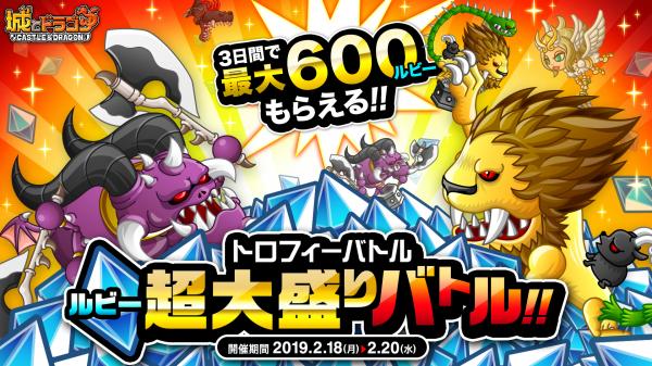 株式会社アソビズム(本社:東京都千代田区、代表取締役:大手智之)は、App Store・Google Playにて好評配信中の『城とドラゴン』で、「トロフィーバトル」および「ルビー超大盛りバトル」を2019年2月18日(月)より開催いたします。