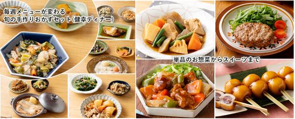 ・毎週メニューが変わる「旬の手作りおかずセット(健幸ディナー)」(※1セットに主菜1品+副菜2品×5食分が入っています。)や手作りのお惣菜や地域名産品からスイーツまで