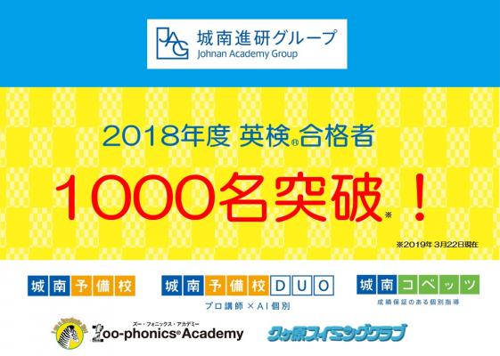 株式会社城南進学研究社(所在地:神奈川県川崎市・代表取締役:下村勝己)は、運営する各ブランドにおいて、2018年度の実用英語技能検定(R)の合格者が1000名を突破し、1164名になりましたことをお知らせいたします。
