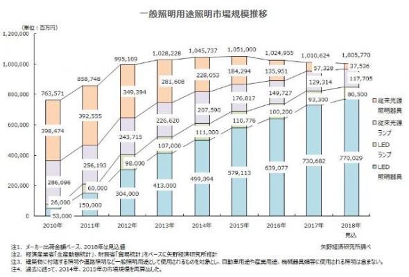 2017年の国内一般照明用途照明市場規模(メーカー出荷金額ベース)は前年比1.4%減の1兆106億2千4百万円、2018年は同0.5%減の1兆57億7千万円の見込みである。2018年のLED照明市場は前年比3.2%増の見込みと成長は継続するものの、LED照明に代替されている従来光源(照明器具+ランプ)市場の縮小が全体市場の拡大を阻む見通しである。