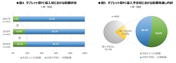 また、導入校に対し、端末の配備状況の内訳を調べたところ、「生徒1人1台配備」と答えた高等学校の割合は合計で19.3%となり、大幅増となった昨年度調査からさらに2.4ポイント増となりました。〈図4〉 この傾向は、今後、タブレット型PCの導入予定があるとする高等学校においては更に顕著で、合計54.0%が「生徒1人1台配備」を見込んでいると答えています。〈図5〉