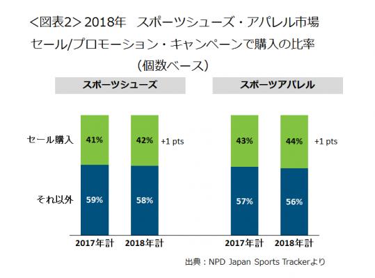 Japan Sports Trackerはセール/プロモーション・キャンペーンで購入したか否か、についても調べています(図表2)。個数ベースで見ると2018年は、スポーツシューズでは42%がセールでの購入で前年同期比+1 pts増でした。スポーツアパレルでは44%がセールでの購入でこちらも同じく前年同期比+1 pts増でした。
