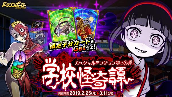 株式会社アソビズム(本社:東京都千代田区、代表取締役:大手智之)は、App Store・Google Playにて好評配信中のリアルタイム合体カードバトル『ドラゴンポーカー』で、2019年2月25日(月)より新スペシャルダンジョン「学校怪奇譚」を開催いたします。今回のダンジョンでは「花子さん」や「踊る人体標本」「歩く二宮金次郎」がボスモンスターとして登場!一緒に冒険する仲間と協力し、ボスモンスターを倒しましょう!