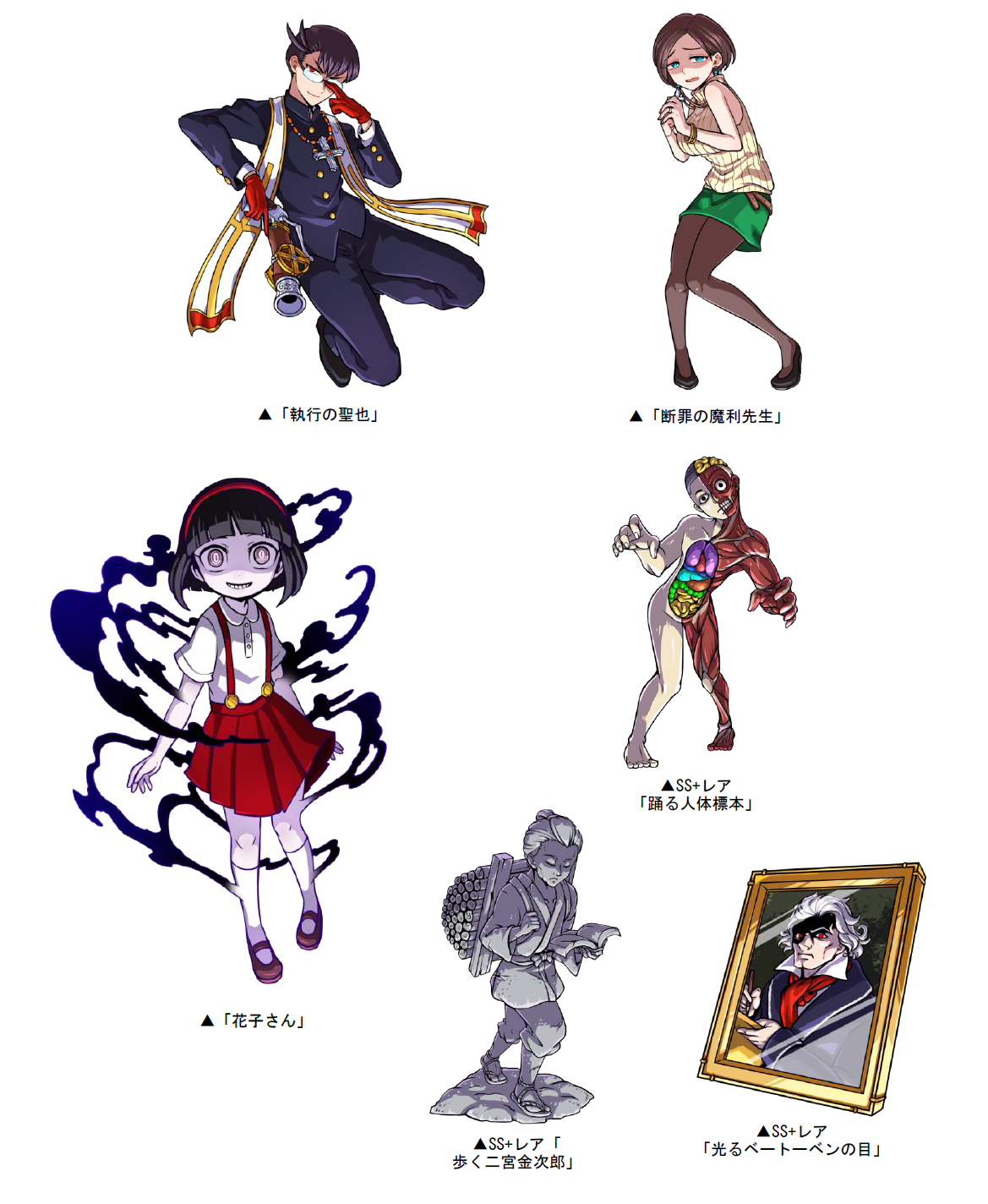 本ダンジョンには、敵として「執行の聖也」「断罪の魔利先生」「花子さん」が登場!さらに、クリアした際に手に入る「七不思議P」を貯めると、ポイントに応じてSS+レア「踊る人体標本」や「歩く二宮金次郎」「光るベートーベンの目」と交換することができます。ダンジョンの最後には、恐ろしい敵が待ち受けているので仲間と一緒に協力してスペシャルダンジョンに挑みましょう!