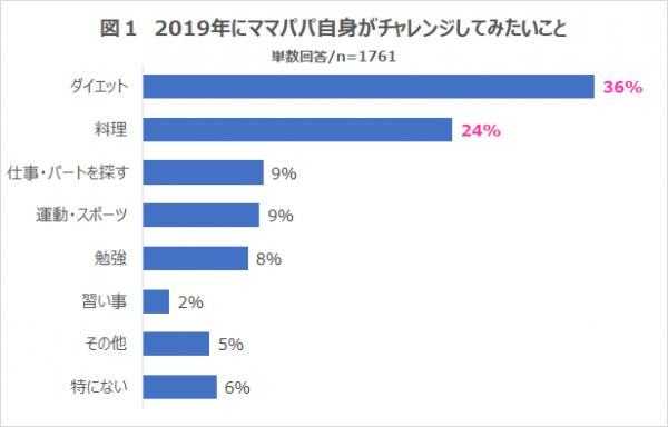 2019年にママパパ自身がチャレンジしてみたいことで第1位は「ダイエット」、第2位は「料理」、第3位は「仕事・パートを探す」と「運動・スポーツ」となりました(図1参照)。
