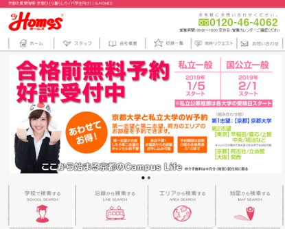 不動産業に特化した業務支援CLOUDサービスを提供する株式会社いえらぶGROUP(本社:東京都新宿区、代表取締役社長:岩名泰介 以下「いえらぶGROUP」)は、京都の学生を中心に賃貸物件情報を提供している「GJHOMES」様のホームページを2019年2月27日にリニューアル、公開しました。 「GJHOMES」様では同時に、受験生に向けた合格前無料予約システムの受付を実施しています。