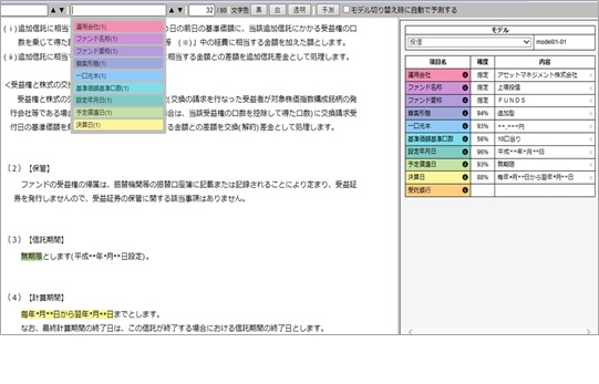 (1) Shinganが抽出した意味のあるデータを、文書上に色分けして表示