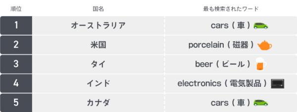 した。また、それらの国で、「Made in japan」に関連付けて一番検索されているワードも下記の通りわか