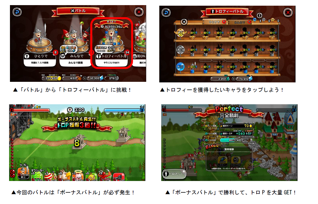 各キャラのトロフィーは、「トロP」を一定数貯めると獲得することができます。トロPを獲得するには、「キャラのLvが20以上」「うまP200以上」など各キャラによって条件が異なります。条件を満たした状態でバトルを行なうことでトロPを獲得できます。また今回は「ボーナスフィーバー」が同時開催され、全てのトロフィーバトルで獲得トロPが2倍以上となります。「ボーナスバトル」はバトルの勝敗に関係なく、獲得トロPが2・3・5・10倍のうちいずれかの倍率で増加します。「ボーナスバトル」で勝利してトロPの大量獲得を目指しましょう!