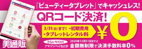 そこで、プロ向け美容材料の通信販売サイト「美通販」では、QRコードでらくらくキャッシュレス決済ができるサロン専用「ビューティータブレット」キャンペーンを開催します。今なら、2019年3月31日(日)までのお申し込みで、(1)タブレットレンタル料、初期費用が無料!※1 (2)2020年12月31日まで金額無制限で決済手数料率0%!※2 といった大変お得な特典もご用意いたしましたので、この機会に多くのサロン様にご利用・ご相談いただければと考えております。