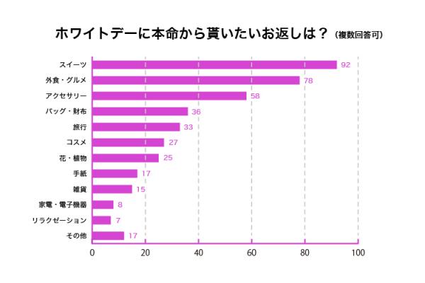 本命から貰いたいお返しは、「スイーツ」が第1位に。続く第2位の「外食・グルメ」と合わせて、食べ物が圧倒的に多いようです。