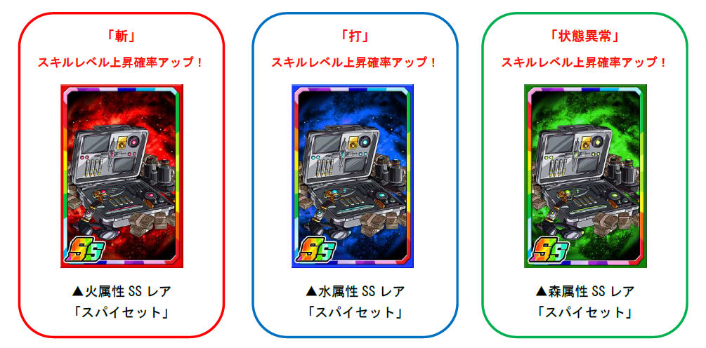 「スパイP」を使い素材ガチャを回すと、限定の強化素材「スパイセット」を手に入れることができます。「スパイセット」は一部のモンスターに使うと強化値2倍の効果があるほか、斬・打・状態異常のスキルレベル上昇確率もアップします。