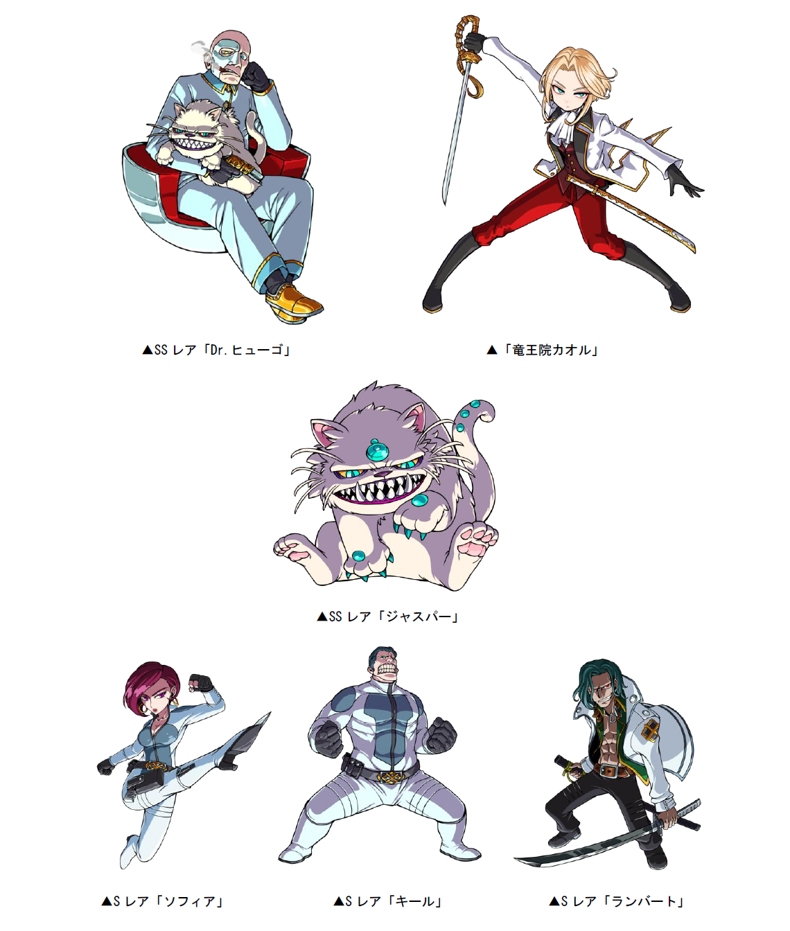 本ダンジョンには新たな敵として、「竜王院カオル」が登場!本ダンジョンをクリアした際に手に入る「スパイP」を貯めると、累計ポイントに応じてSSレア「Dr.ヒューゴ」、Sレア「ソフィア」「キール」「ランバート」を入手することができます。また、ボスを倒すと、まれに「ジャスパー」が出現。倒すと限定子分カード「ジャスパー」が手に入ることがあります。ジャスパーは「Dr.ヒューゴ」と一緒に装備すると、子分スキルが強力になります。