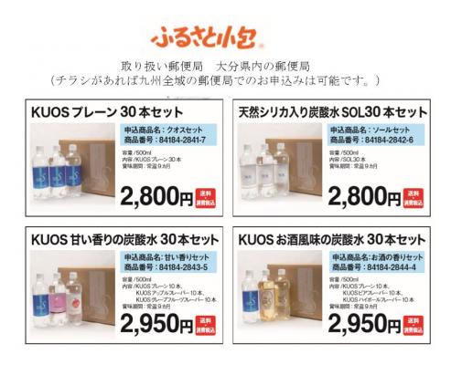 E-コマースにて販売している主力商品、うまさを感じる強炭酸水『KUOS-クオス-』を郵便局のふるさと小包チラシで販売を開始します。郵便局窓口でお申込みできます。取り扱い郵便局は、大分県内の全郵便局(302局)となりますが、チラシがあれば九州全域の郵便局でのお申込みが可能です。