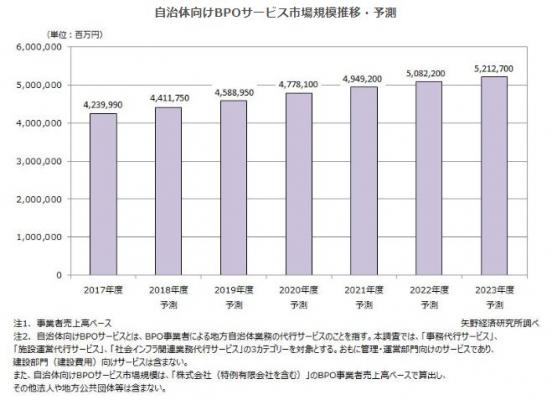 事務代行、施設運営代行、社会インフラ関連業務代行いずれのサービスも引き続き伸長する見通しである。市場の拡大とともに自治体向けBPOサービス市場にはさまざまなプレイヤーが現れており、自らの環境にあったBPOサービスを選択し、導入する地方自治体が増えている。こうしたことから、2017年度から2023年度までの年平均成長率(CAGR)は3.5%で推移し、2023年度の国内自治体向けBPOサービス市場規模(事業者売上高ベース)は5兆2,127億円になると予測する。