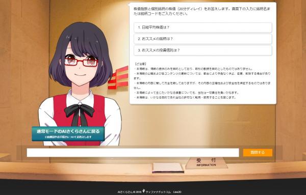 岡三オンライン証券株式会社(以下岡三オンライン証券、本社:東京都中央区)に導入されている株式会社ティファナ・ドットコム(以下ティファナ・ドットコム、本社:東京都目黒区、代表取締役社長:藤井亮)の人工知能(AI)接客システム「AIさくらさん」に、新たに「株価モード」が搭載されたことを2019年3月15日発表します。なお、岡三オンライン証券株式会社は、2019年3月15日よりWebサイト上で株価などの案内を開始しました。