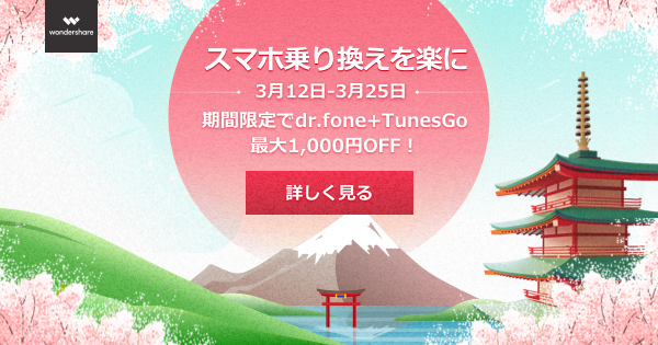 3月になると、携帯電話やスマートフォンの機種変更を検討するのにぴったりのシーズンがきました。Wondershareは dr.foneを始め、スマホ乗り換えを応援する最大1000円引きのスペシャルセールを開催いたします。期間限定のお得な価格で、人気商品「dr.fone」をご購入いただけます。