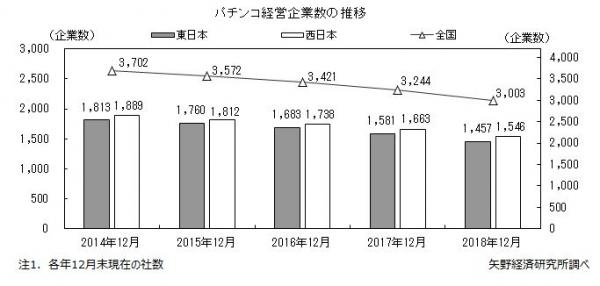 2018年12月末のパチンコホール経営企業数は前年比241社減の3,003社であった。パチンコホール経営企業数は、2008年から2012年までは比較的減少幅が小さかったものの、2013年以降は年間100社以上のペースで減少しており、過去15年以上にわたって減少が続いている。なお、2018年は200社以上減少したが、これは5号機への移行が完了した2008年以降で最大の減少数である。なお、資本や経営者などで関連する企業をグループ化すると、パチンコホール経営企業は2,297のグループに集約できるが、企業グループ数は2017年末から2018年末までの一年間で163グループ減少した。
