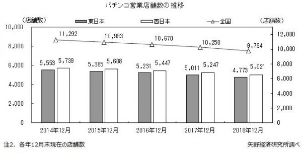 また、2018年12月末時点で、全国で営業しているパチンコ店は9,794店舗であった。2012年以降は毎年店舗の減少数が大きくなっており、2018年末では前年比464店舗の減少であった。2014年末からは1,498の店舗が減少している。企業数や店舗数の減少は、これまで同様、主に1店舗経営などの小規模なパチンコホール経営企業の撤退や倒産が原因となっている。