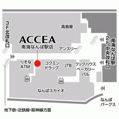 『アクセア南海なんば駅店』は都南海電鉄「なんば駅」2階中央改札口を出てすぐのアクセスです。駅直結のショッピングモール「なんばCITY」の2階にオープンいたします。