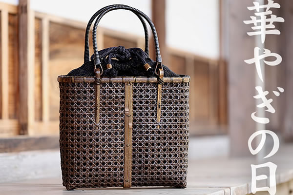 4種類の籐バッグは大きさやデザイン、使い勝手も個性豊か。「染籐手提げ籠バッグ(黒革持ち手)」の特徴は何と言っても黒革の持ち手部分です。圧倒的な存在感とは対照的にソフトな持ち心地で、大き目のバッグ本体を安定して支えてくれます。「染籐手提げ籠八ツ目バッグ」は、軽快感のある八ツ目編みで和装にも洋装にもお使い頂きたい逸品です。そして「籐手提げミニ籠バッグ」は落ち着いた大人の雰囲気の染籐と、カジュアルで軽快な感じの白籐の2種類から選べるミニバッグ。コロンと可愛いフォルムが印象的です。