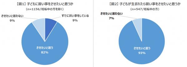 子どもに習い事をさせたいかを伺ったところ、「すでに習い事をしている」が9%、「させたいと思う」が82%となりました(図1参照)。また、妊娠中の方にも同様に伺ったところ、「させたいと思う」が93%に(図2参照)。子どもの習い事について前向きに捉えている方が9割以上という結果になりました。この結果からも、ママパパの習い事に対する関心度の高さが伺えます。