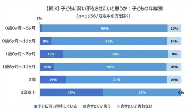 子どもの年齢別で見てみると、2歳までは「させたいと思わない」という回答が約10%いるのに対し、3歳以上になると「させたいと思わない」という回答が0%になります(図3参照)。この結果から、子どもが成長し、ある程度のことを自分でできるようになる月齢を目安に習い事への関心がより高まると言えるのではないでしょうか。