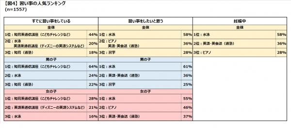 習い事をしたいと思う方の習い事人気ランキング第1位は「水泳」で58%、第2位「ピアノ」「英語・英会話(通塾)」で36%、第3位「習字」で28%となりました(図4参照)。すでに習い事をしている方の上位である「知育系・英語系通信講座」は、習い事をしたいと思う方の順位では上位に入らず、やりたいと思う方はすでに始めている可能性があります。通信講座であれば子どもの送り迎えが不要、週のスケジュール調整をしなくて良いなどママパパの負担が少なくてすむというのも要因の一つかと考えられます。