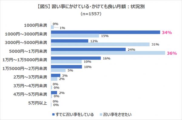 すでに習い事をしている方の月額は「1000円~3000円未満」が最も多く34%となりました(図5参照)。習い事の人気ランキング1位が「知育系通信講座」なので、納得の金額です。一方、習い事をさせたいと思う方のかけても良いと思う月額は「5000円~1万円未満」が36%で最多という結果に。世帯年収別で見ても、習い事にかけている・かけても良い月額と、年収が高い・低いとの関連性はありませんでした。