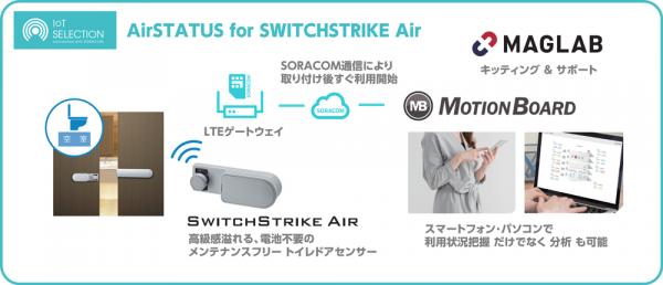 IoT/AIの実証実験(PoC)を中心に、様々な生活・業務の課題を解決してきた株式会社MAGLAB(本社:高知県高知市帯屋町、代表取締役:武市 真拓、以下MAGLAB)と、株式会社シブタニ(本社:大阪府大阪市、代表取締役社長:石橋 芳男、以下シブタニ)、ウイングアーク1st株式会社(本社:東京都港区、代表取締役社長:田中 潤、以下ウイングアーク)は、メンテナンスフリーのトイレ個室利用分析IoTソリューションを3社共同で開発しました。MAGLABが、トイレ個室の利用状況を分析可視化するIoTソリューション「SWITCHSTRIKE Air」をハードウェアとその設定をすべて含め、ソラコムの企画するIoT サブスクリプション・マーケットプレイス「IoT SELECTION connected with SORACOM」を通じて、3月20日(水)より提供を開始します。