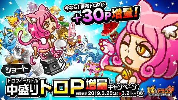 株式会社アソビズム(本社:東京都千代田区、代表取締役:大手智之)は、App Store・Google Playにて好評配信中の『城とドラゴン』で、「ショートトロフィーバトル 中盛りトロP増量キャンペーン」を2019年3月20日(水)より開催いたします。