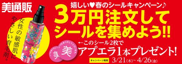 「美通販」で、3万円(税抜)以上のお買い上げにつき、お荷物にシールを1枚同封いたします。シールを2枚集めて応募された方へ、もれなく全員に人気の育毛剤「アプエラ 薬用スカルプエッセンス」(株式会社レイナカンパニー)を1本プレゼントいたします。「アプエラ 薬用スカルプエッセンス」は、「酵素」のチカラで健やかな髪へ導く、女性の敏感肌にもやさしい育毛剤です。育毛環境の土台をつくる「酵素」を含む3種の有効成分と9種の植物成分を贅沢に配合。ノンアルコールタイプなので、刺激が苦手な方やお肌の弱い方でも安心してお使いいただけます。加齢とともに髪が細くなりボリュームがでない、分け目が目立つなど、薄毛・細毛に悩む多くの方のニーズにお応えするためにつくられた、「美通販」でも人気の高い育毛剤です。