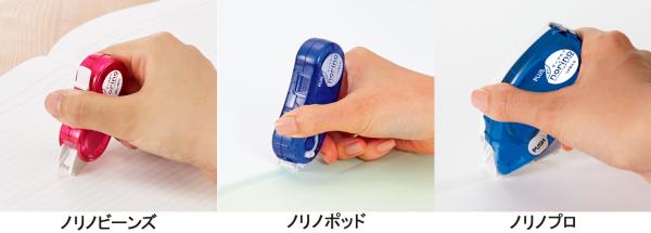 糊タイプは、プリント貼り、封筒とじなどマルチに使えるキレ抜群のドット糊「しっかり貼れる」タイプ。メーカー希望小売価格(税抜)は、「ノリノビーンズ」300円、「ノリノポッド」360円、「ノリノプロ」520円。「ノリノポッド」「ノリノプロ」は、長く使えるつめ替え式です。