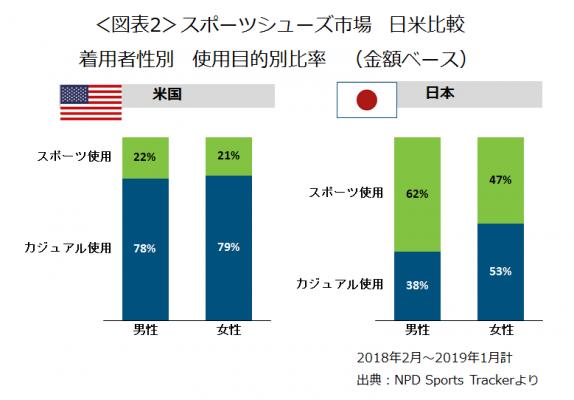 日米のスポーツシューズ市場を着用者性別で見てみます。米国では、使用用途比率は男女でほぼ同じです。スポーツ使用は男性では21%(カジュアル使用79%)、女性では22%(カジュアル使用78%)です。