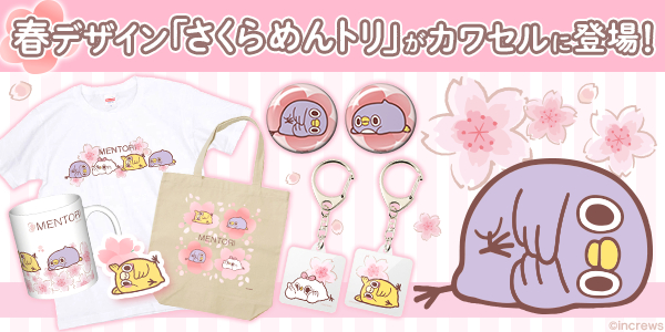 株式会社インクルーズ(東京都渋谷区、代表取締役 山崎 健司)が企画・運営するキャラクターグッズのECサイト「カワセル」にて、3月27日(水)よりLINEスタンプ「面倒だがトリあえず返信」シリーズから生まれた大人気キャラクター「めんトリ」の新デザインアート「さくら×めんトリ」のカワセル限定グッズが発売開始になりましたことをご報告させていただきます。