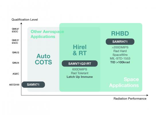 SAMV71Q21RTの耐放射線性能は、地球低軌道(LEO)衛星コンステレーション、ロボット工学等のNewSpaceアプリケーションに理想的です。一方SAMRH71は、ジャイロスコープ、スタートラッカ機器等のよりクリティカルなサブシステムに適した耐放射線性能を備えています。SAMV71Q21RT耐放射線デバイスは30 krad (Si)のTIDとラッチアップ耐性を確保しており、重イオン入射に影響されません。どちらのデバイスも、シングルイベント ラッチアップ(SEL)に対して62 MeV/( mg /cm⊃2;)までの耐性を持っています。