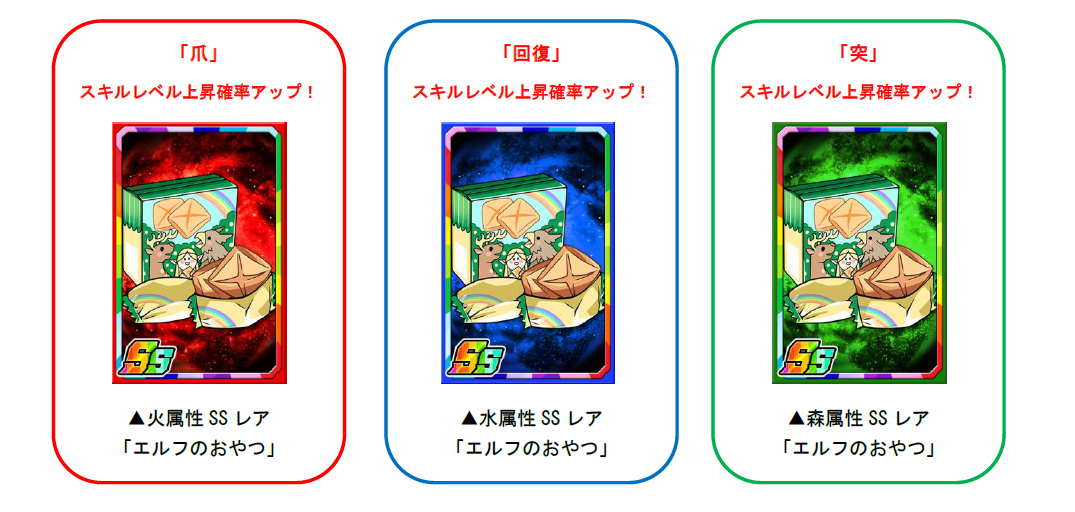 「歌姫P」を使いポイント交換、または素材ガチャを回すと、限定の強化素材「エルフのおやつ」を手に入れることができます。「エルフのおやつ」は一部のモンスターに使うと強化値2倍の効果があるほか、爪・回復・突のスキルレベル上昇確率もアップします。