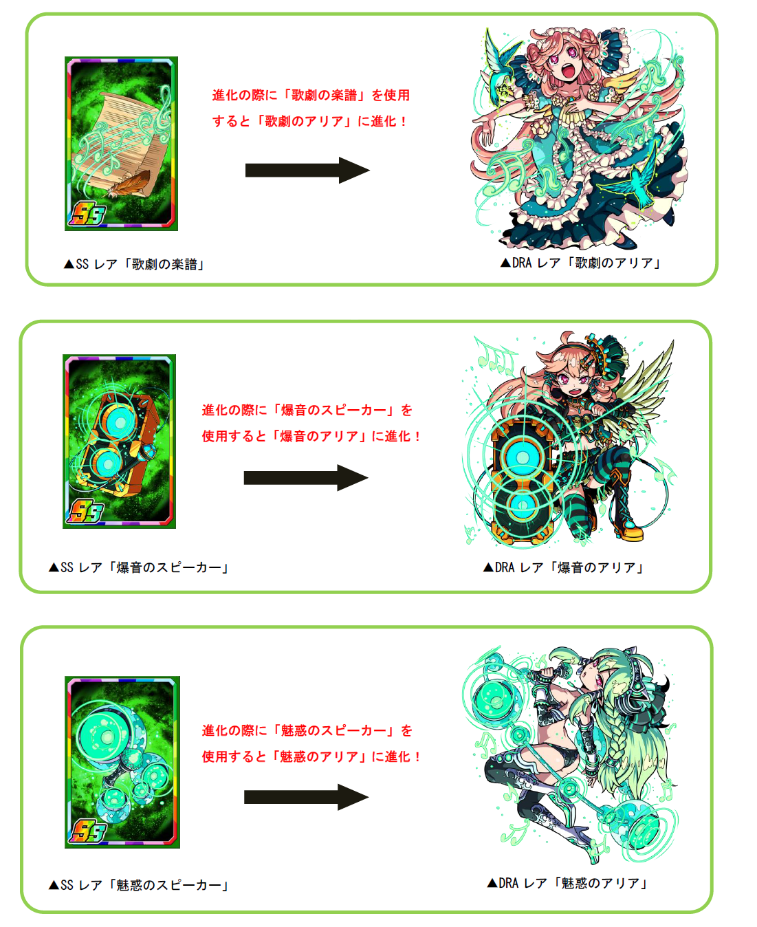 ダンジョンのボスを倒すと、宝箱から進化素材「歌劇の楽譜」「爆音のスピーカー」「魅惑のスピーカー」が手に入ることがあります。これらの進化素材を使用すると、素材に応じた「アリア」に進化させることができます。また、進化素材は、全てのスキルのスキルレベル上昇確率がアップする強化素材として使用できます。