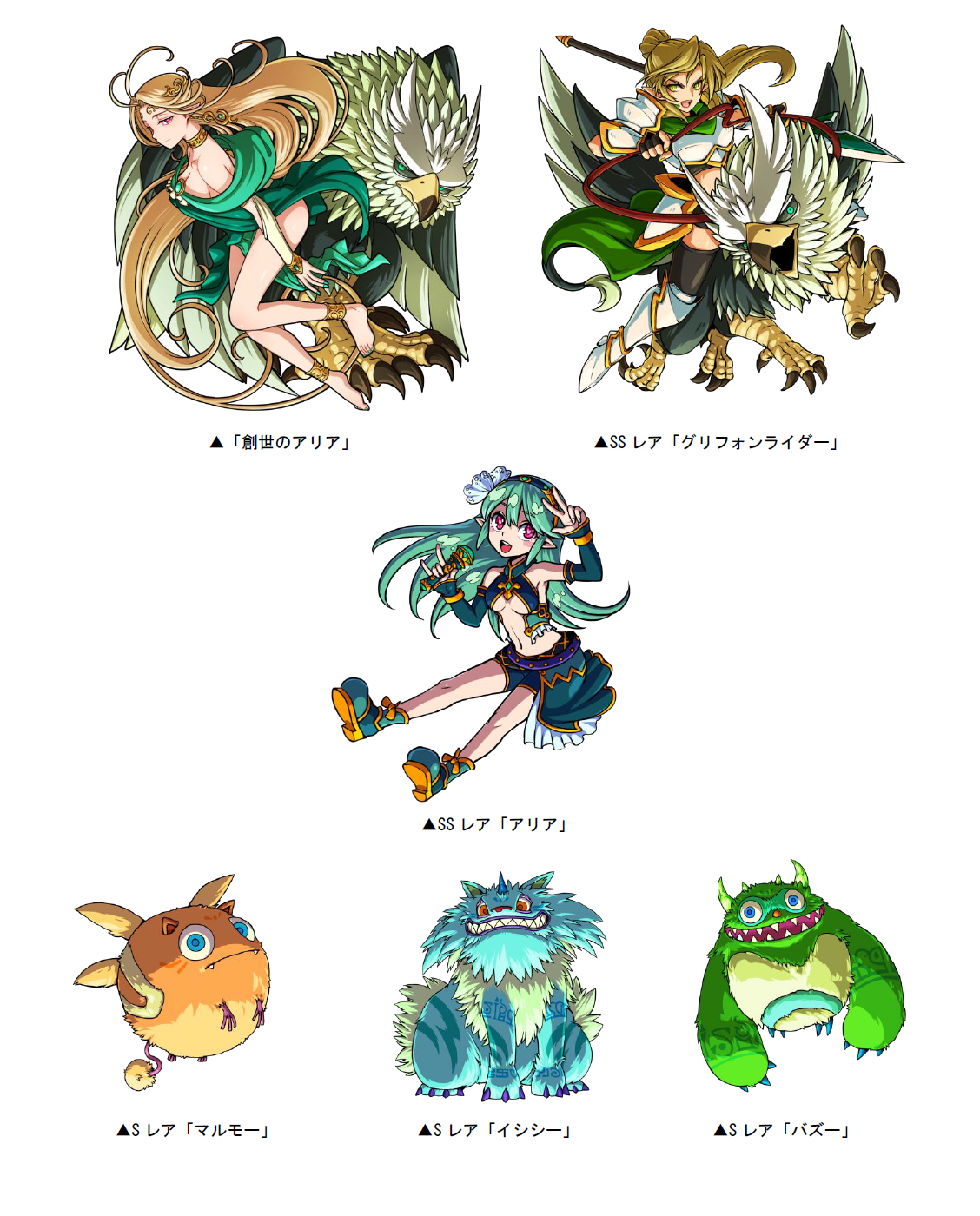 本ダンジョンには新たな敵として、「創世のアリア」や「グリフォンライダー」が登場!本ダンジョンをクリアした際に手に入る「歌姫P」を貯めると、SSレア「アリア」やSレア「マルモー」「イシシー」「バズー」と交換ができます。