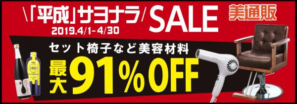 平成がいよいよ新年号へと変わります。「平成サヨラナSALE」は、日頃よりご愛顧いただいているサロン様へ、平成31年間の感謝の意を込めた、大変お得なキャンペーンです。期間中はセット椅子やサロンワゴンなどの美容機材から美容用品まで、人気のサロンアイテムが最大91%OFF!「美通販」ならではの業界最安値を目指した特別価格で販売いたします。平成最後の謝恩セールは、2019年4月1日(月)~4月30日(火)まで。