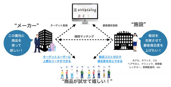 quatreは「ライフサイクルの中に商品と出会える楽しさを」のミッションの下、メーカーの商品と施設・場所のマッチングプラットフォームである「aircatalog」を開発・運営しております。メーカーが潜在顧客の開拓にあたり、商品の使用体験をしてもらうことを望む一方で、従来の販促手法では、狙うべきターゲット層に商品を届けることは困難であったと考えられます。他方、ホテルやオフィスをはじめとした様々な施設では、顧客・従業員満足度を高めたいと考える一方で、満足度向上の施策に対するコストが課題として挙げられます。aircatalogは、メーカーが潜在顧客に使用体験を望む商品をプラットフォーム上に登録し、施設が商品一覧の中から配布したい商品を選択後、メーカーの承認を経てマッチングが成立します。これにより、メーカーからは狙うべきターゲット層に対しリーチが可能になり、施設としてはコストをかけずに顧客満足度の向上が期待出来ます。quatreでは、質の高い商品体験(Product Experience=PX)の機会を創出することを目指しており、メーカーに新たなプロモーションの手段を提供するとともに、これまでの販促手法とは一線を画した、高いプロモーション効果が得られる手段を提供していると考えております。