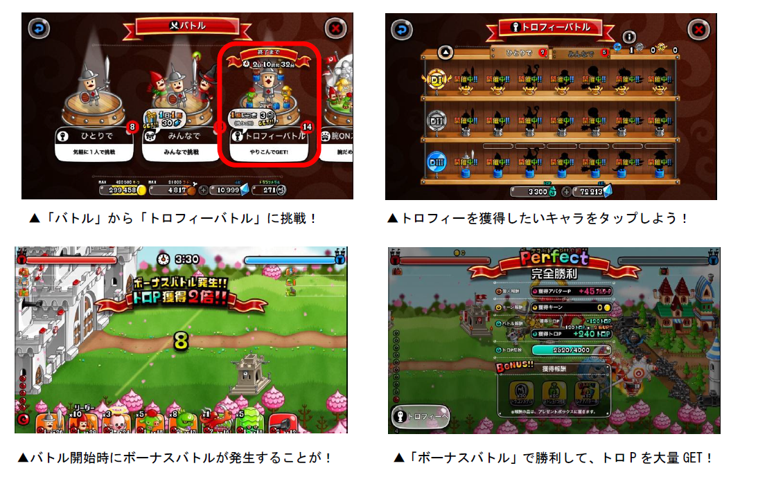 各キャラのトロフィーは、「トロP」を一定数貯めると獲得することができます。トロPは「キャラのLvが20以上」「うまP200以上」など、各キャラによって異なる条件を満たした状態でバトルを行なうと獲得できます。また、バトルを開始すると「ボーナスバトル」が発生することがあり、バトルの勝敗に関係なく、獲得トロPが2・3・5・10倍のうちいずれかの倍率で増加します。ボーナスバトルが発生したら、勝利してトロPの大量獲得を目指しましょう!