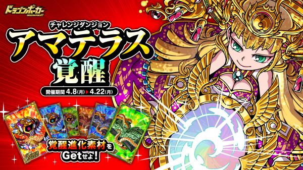 株式会社アソビズム(本社:東京都千代田区、代表取締役:大手智之)は、App Store・Google Playにて好評配信中のリアルタイム合体カードバトル『ドラゴンポーカー』で、2018年4月8日(月)より復刻チャレンジダンジョン「アマテラス覚醒」を開催いたします。