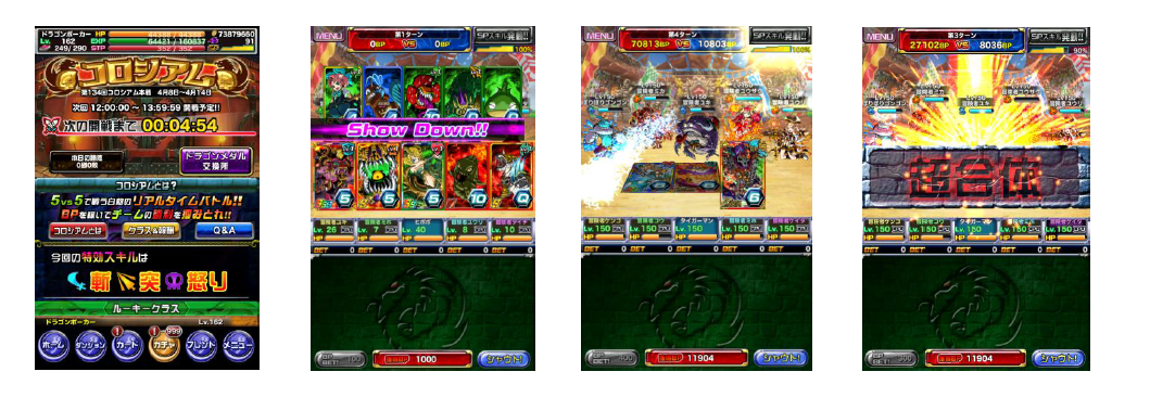 コロシアムのバトルは、5人vs 5人で1人1枚ずつカードを出して役勝負をします。より強い役を作ったチームが先攻となり、相手チームへ攻撃を行います。攻撃時に与えたダメージはBPとして加点され、5ターン終了後、合計BPが多いチームが勝利となります。