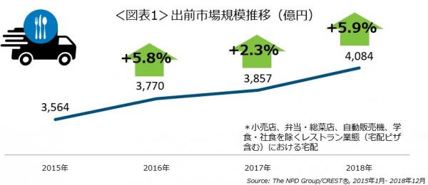 レストラン業態(小売店、自販機、社員食堂、学生食堂を除く。宅配ピザを含む)における出前市場は、2018年(1-12月計)に4,084億円で、前年と比べ5.9%増加しました(図表1)。2016年は+5.8%、2017年は+2.3%増加しており、外食・中食市場全体の成長率(2%前後)と比較して高い成長を示しています。
