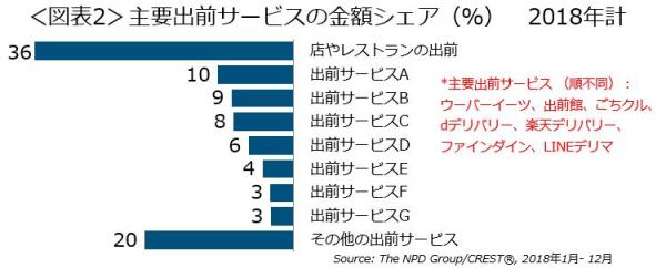 出前でどのサービスを利用したかのサービス別金額シェアをみると(図表2)、店やレストランからの直接の出前が36%と依然最も多いものの、主要出前7サービス(ウーバーイーツ、出前館、ごちクル、dデリバリー、楽天デリバリー、ファインダイン、LINEデリマ)も合計で約44%を占め、出前全体の半数近くに迫っていることがわかりました。