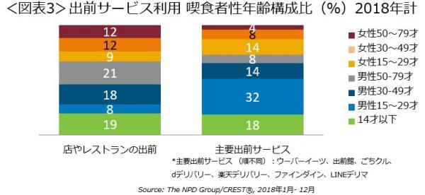 出前の利用者層をみると(図表3)、店やレストランからの直接の出前は30才以上の男性が多いのに比べ、主要出前サービスは、15~29才の若い男性の利用が32%を占め主要顧客となっていることがわかりました。14才以下の子供と一緒に食べる機会に利用が多いのは出前全体の傾向です。