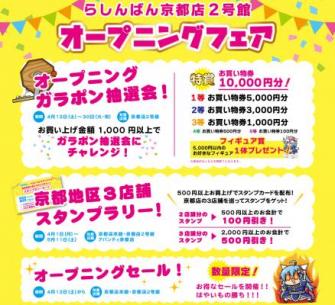 2号館のオープンを記念として、13日(土)よりオープニングフェアを開催、豪華景品が当たるガラポン抽選会をはじめ、らしんばん京都店本館・らしんばん京都店2号館・らしんばんアバンティ京都店の3店舗が連動したスタンプラリーなどを実施いたしますので、ぜひお越しください。